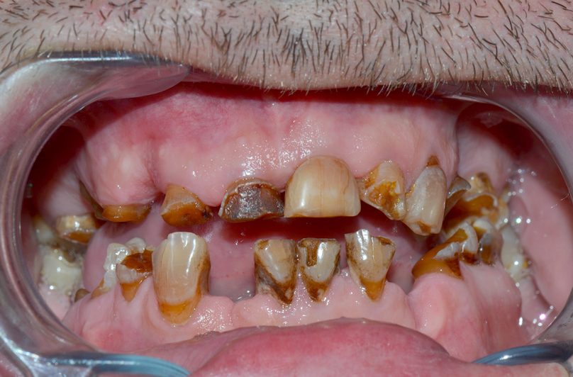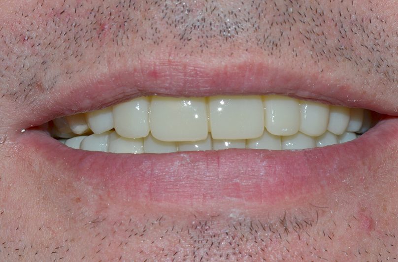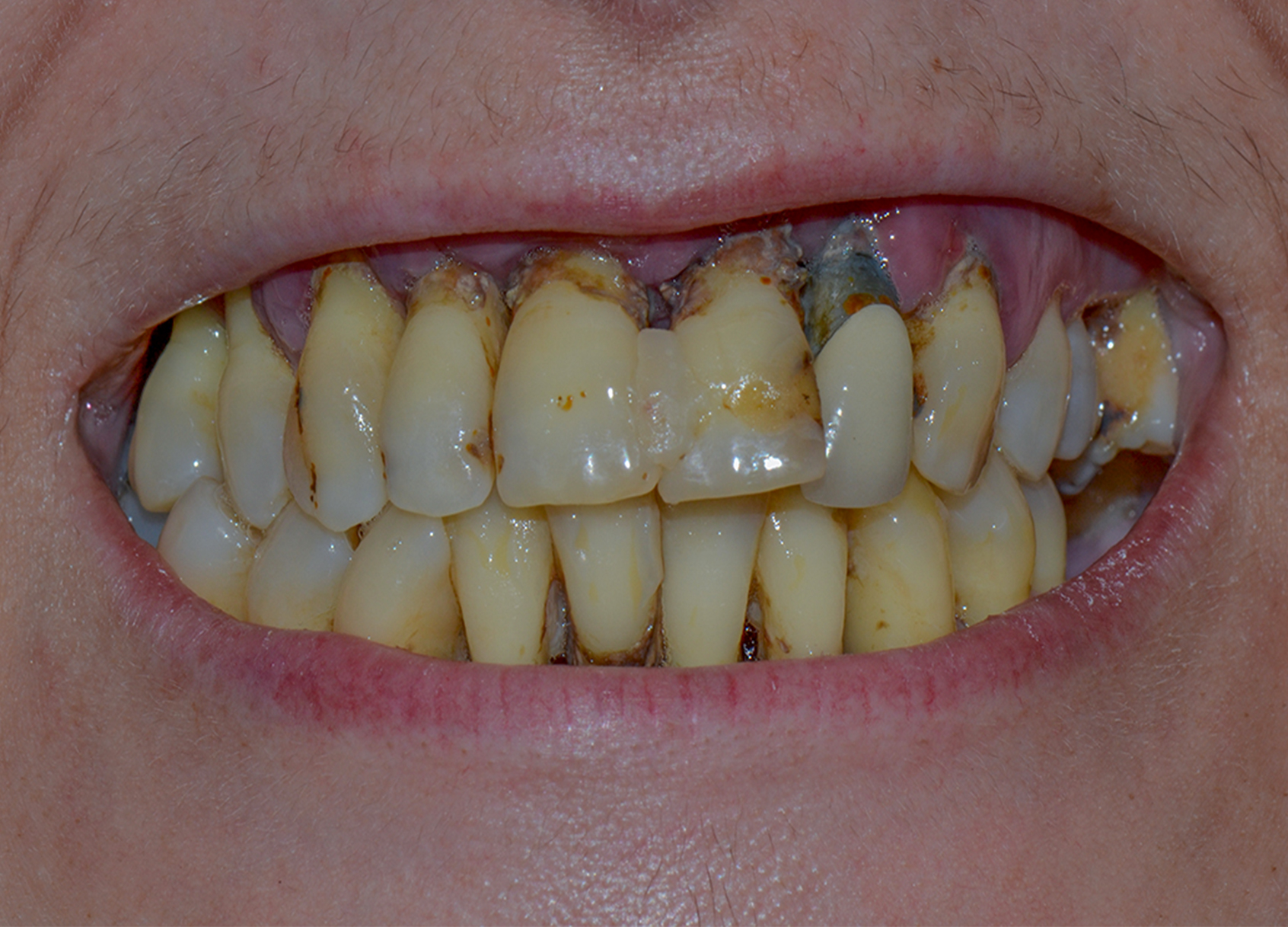 Patient âgé de 35 ans avec toutes les dents cariées, mobiles et sensibles. Extraction de certaines dents, pose de 4 implants en haut et 4 en bas. Réhabilitation esthétique et fonctionnelle avec deux bridges complets céramique scellés sur les implants (prothèse fixe).