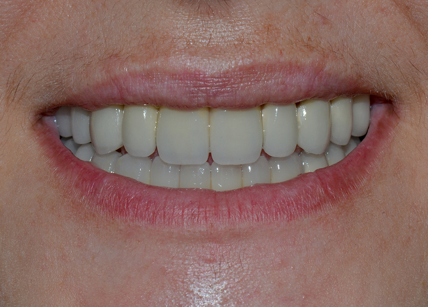 Patiente âgée de 32 ans avec toutes ses dents cariées, mobiles et sensibles. Extraction de toutes les dents, pose de 8 implants en haut et 6 en bas. Réhabilitation esthétique et fonctionnelle avec deux bridges complets céramique scellés sur les implants (prothèse fixe).
