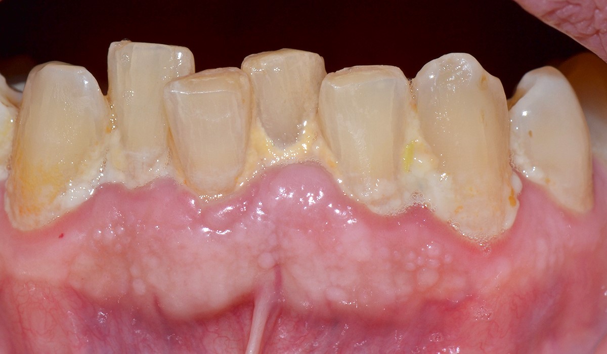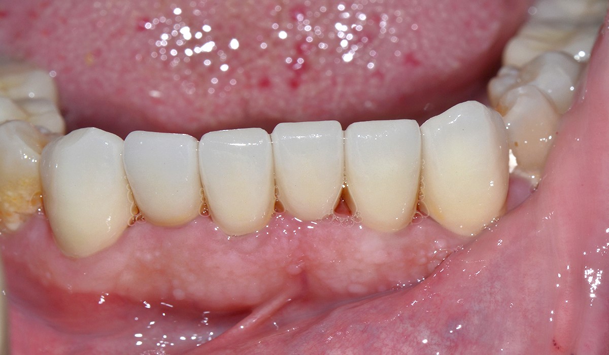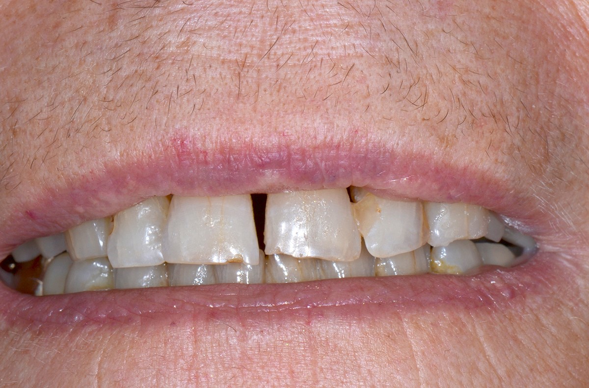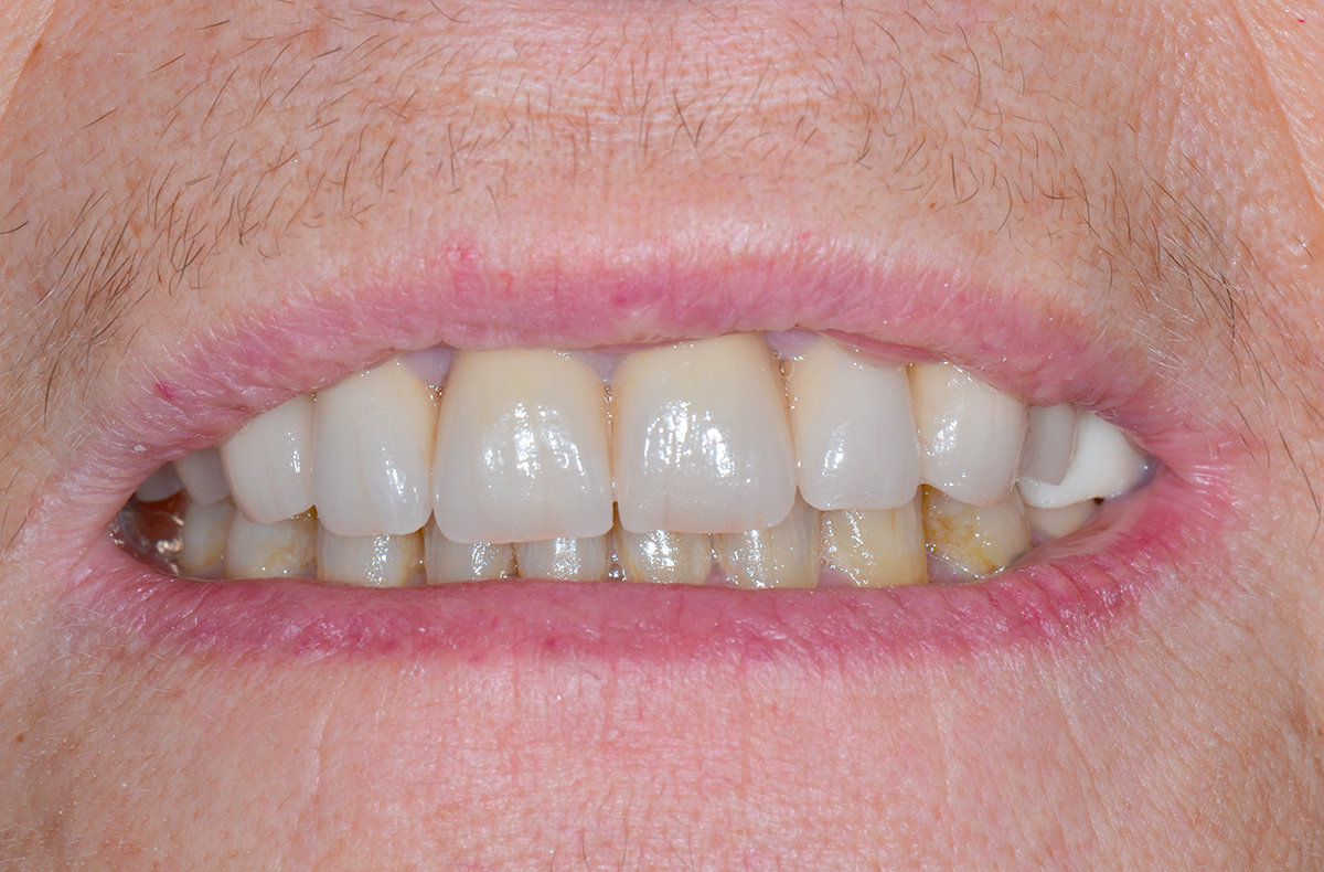 Patiente présentant des dents mobiles avec des migrations laisant apparaître des espaces. Un bridge céramique est réalisé de manière à supprimer les espaces et immobiliser les dents.