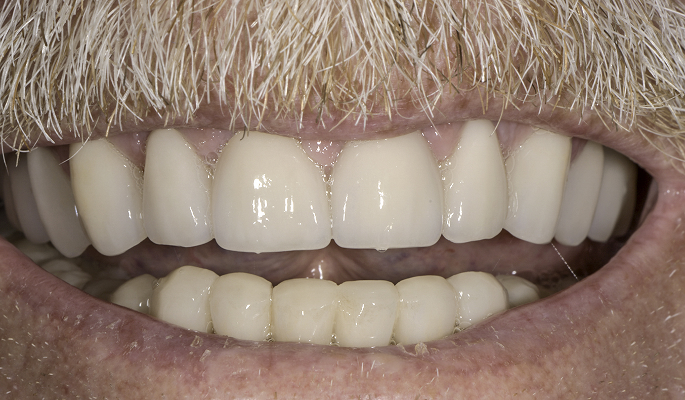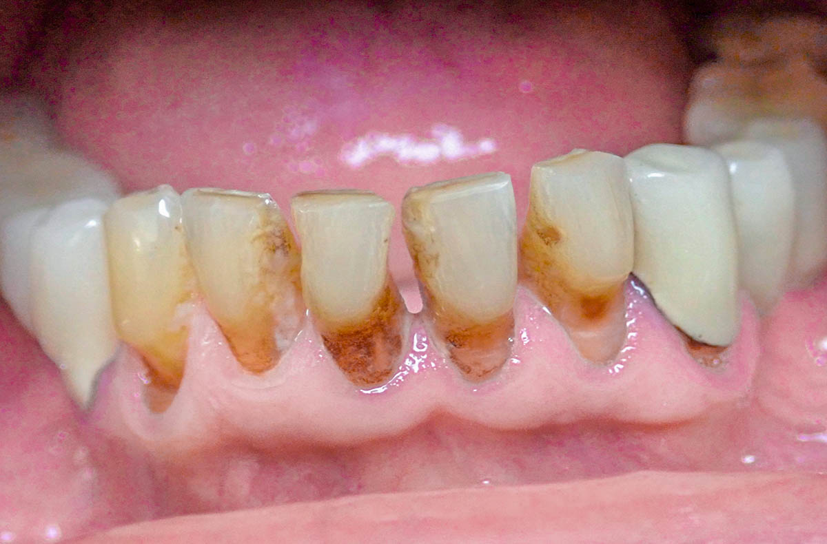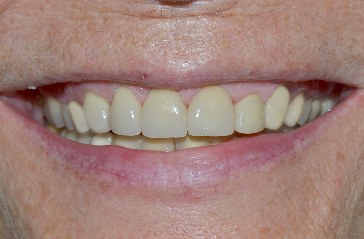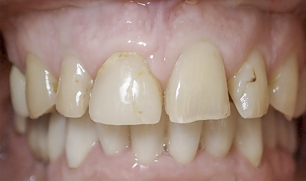 Patient atteint de rétraction de gencive avec apparition d’espace entre les dents. Des composites ont été réalisés de manière à protéger les racines exposées et éliminer les espaces interdentaires.