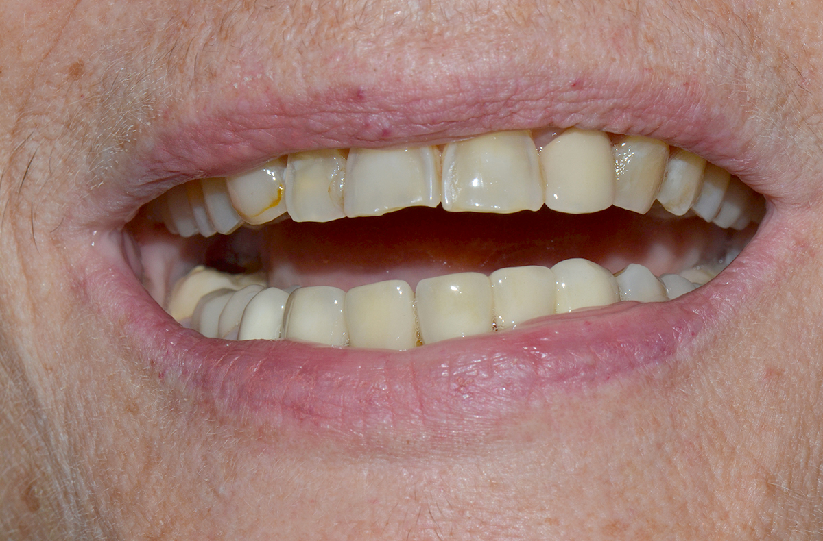 Patient grinçant des dents de manière excessive (bruxisme). Des restaurations au composite permettent de redonner une hauteur aux dents et soulager ainsi les articulations. L’esthétique et la fonction sont restaurés.